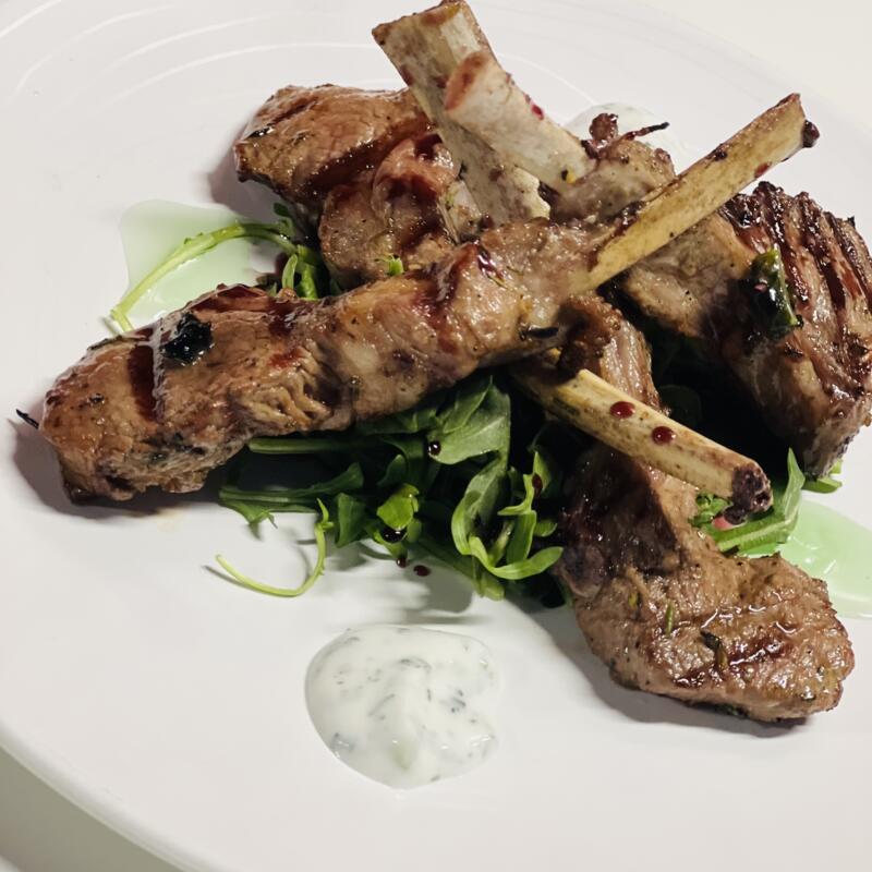 Espresso rub 100% grass fed New Zealand rack of lamb, paired with an Indian minty sauce.