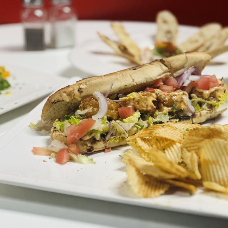 Charbroil grilled pesto marinated chicken breast, melted mozzarella, tomatoes served on a grilled bun.