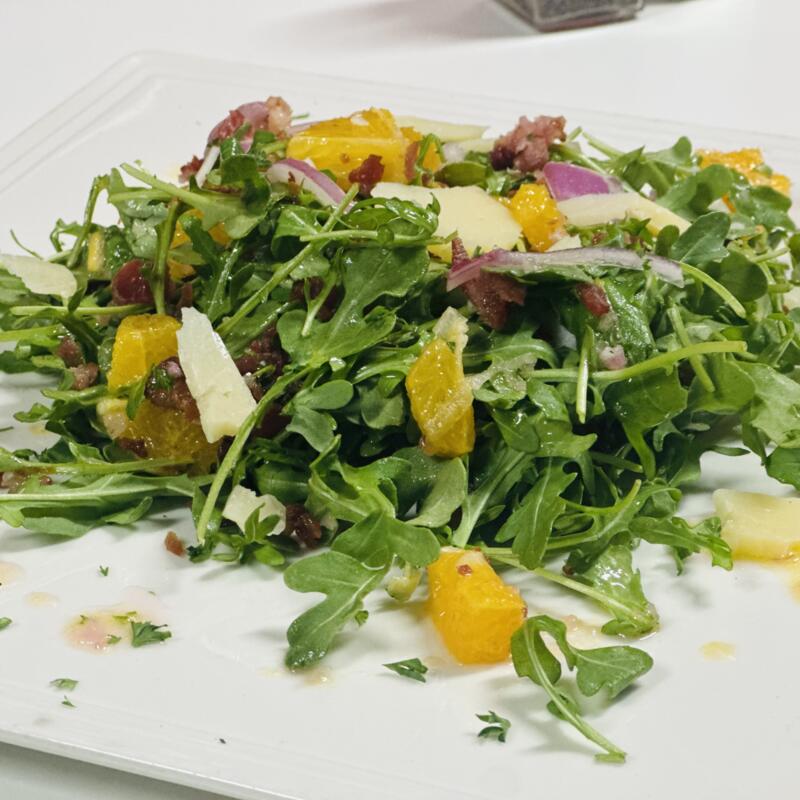 Arugula, fresh mozzarella, cantaloupe, prosciutto, heirloom tomatoes, balsamic glaze, and basil emulsion.