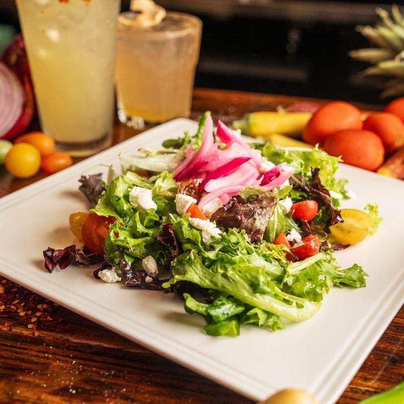 Mix greens, pickled onions, tomatoes, goat cheese, and calamata olives tossed in a pineapple vinaigrette.