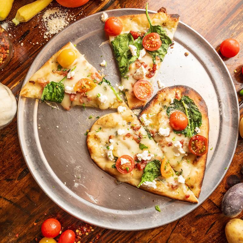 Melted mozzarella or vegan cheese, spinach, onions, tomatoes, mushrooms, and calabrian sauce.